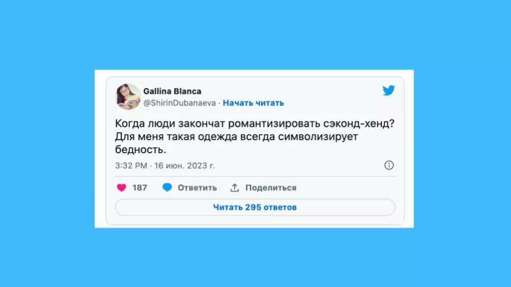 Поводом для дискуссии стал твит, вопрошающий о том, когда люди перестанут романтизировать вещи из вторых рук. Пост собрал порядка 2 миллионов просмотров в сети.