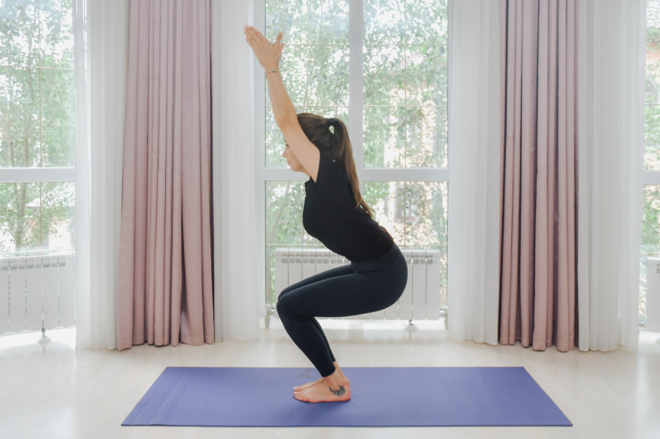 Стопы держим вместе, если сложно, то ставим их на ширине таза. Раскрываемся в грудном отделе, ладонями, локтями и предплечьями тянемся вперед и вверх. Присаживаемся как можно ниже по мере своих возможностей, давления и веса. Вес тела переходит на пятки.