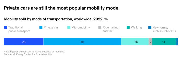 На данный момент предпочтительным и преимущественным транспортным средством является личный автомобиль. Но, по прогнозам экспертов, доля перевозок, совершаемых на личных авто, с 45 процентов в 2022 году снизится до 29 процентов к 2035 году.