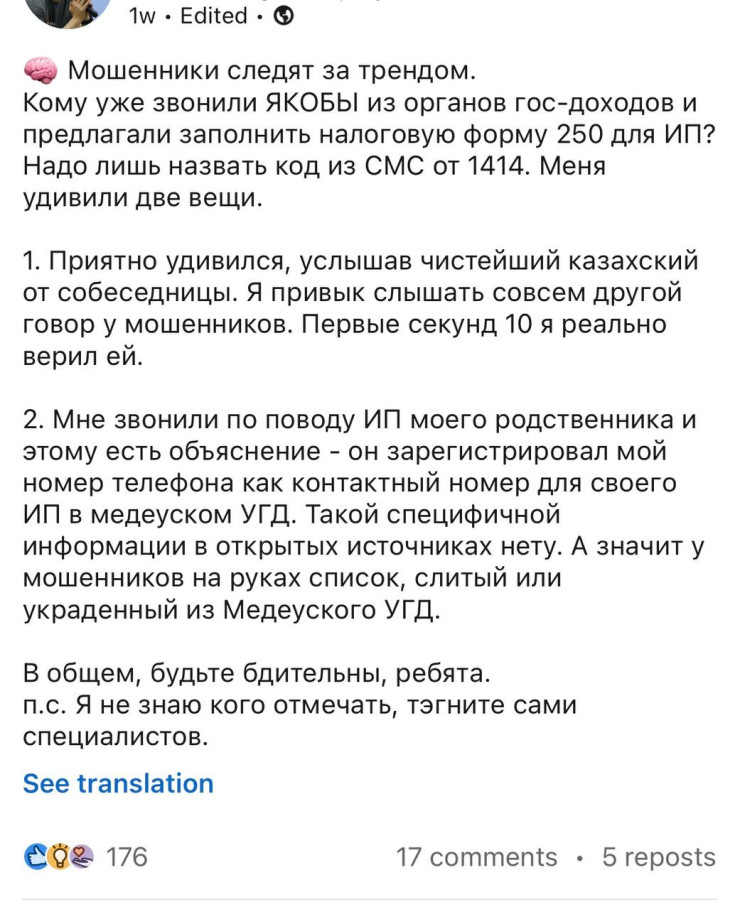 "Мошенники следят за трендом. Мне позвонили якобы из органов государственных доходов и предложили заполнить налоговую форму 250 для ИП. Для этого нужно было назвать код из SMS от 1414. Вначале я поверил собеседнице, так как она говорила на чистом казахском, что для мошенников необычно. Но удивило то, что звонили по поводу ИП моего родственника, который зарегистрировал мой номер как контактный. Эта информация не находится в открытых источниках, значит, данные были украдены из Медеуского УГД", - написал казахстанец в своем блоге.