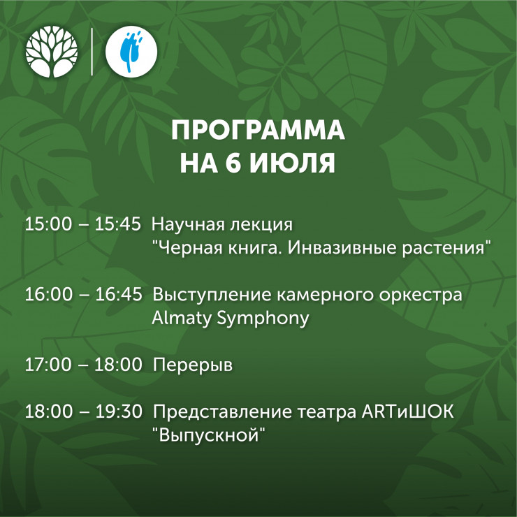 - 15:00 — на сцене выступит научный сотрудник лаборатории дендрологии Абдухадыр Айнагуль с лекцией на тему "Черная книга. Инвазивные растения";