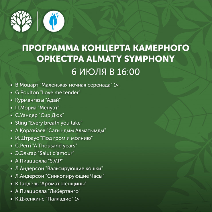 - 16:00 — концерт музыкантов камерного оркестра Almaty Symphony. В программе прозвучат популярные классические произведения Штрауса, Моцарта, Пиаццолла и многое другое;