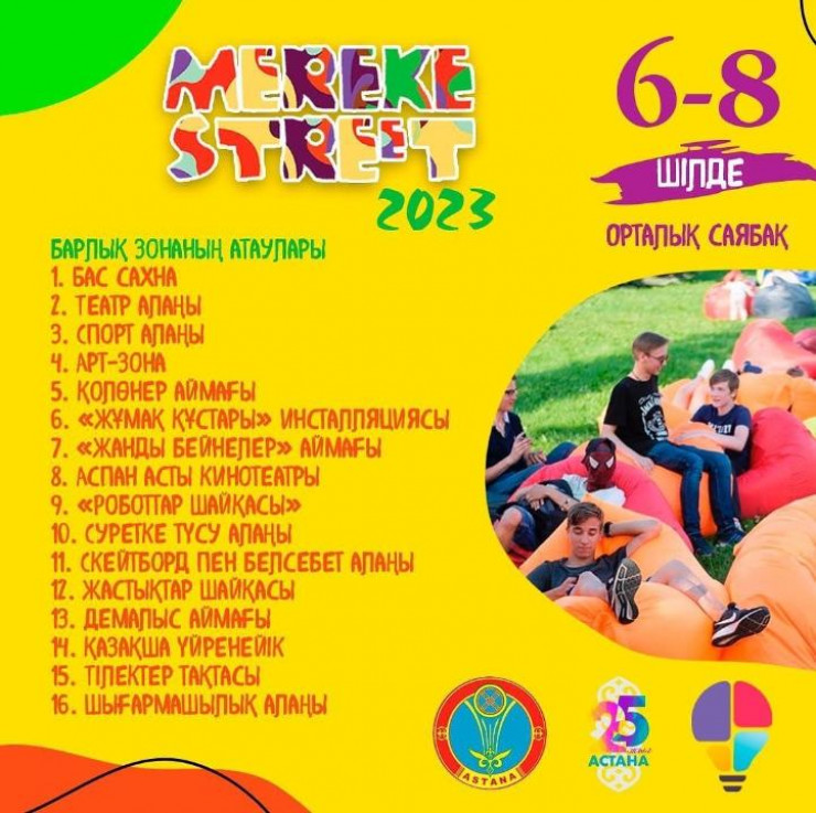 В Центральном парке для детей будет организован фестиваль Mereke Street. Площадь разделят на несколько зон, где будут проходить театральные постановки, шоу роботов, конкурсы рисунков, мастер-классы и спортивные активности.