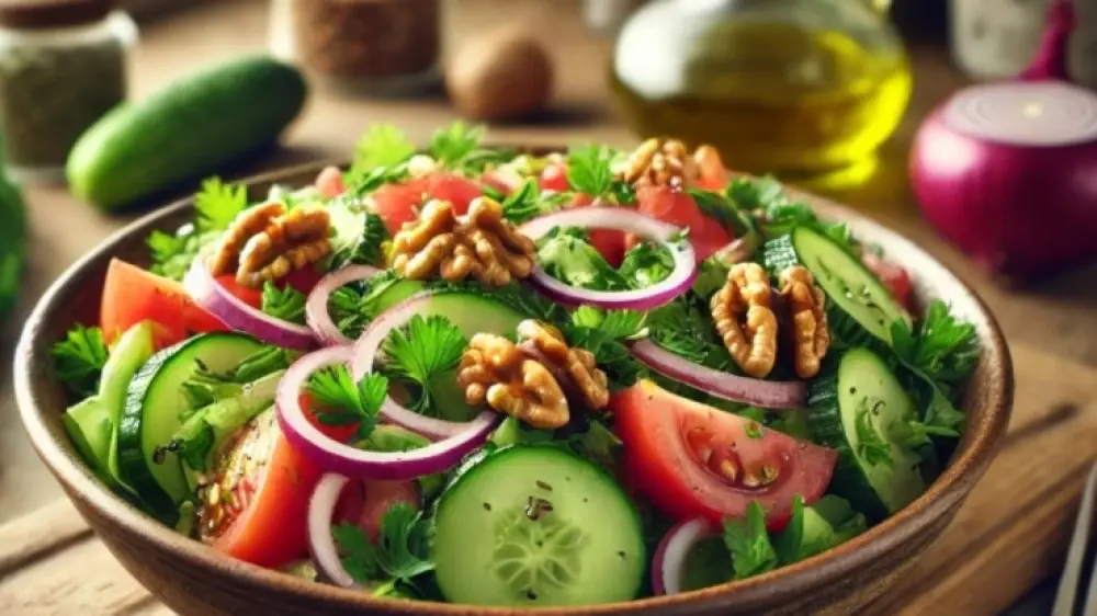 - Смешайте все ингредиенты в миске, добавьте оливковое масло, посолите и поперчите.