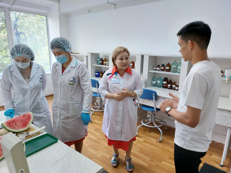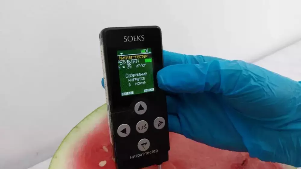 «Мы измеряем количество нитратов в арбузе специальным прибором - экспресс-нитратометром. С помощью этого прибора можно сразу узнать результат. Обычно количество нитратов в этом фрукте не должно превышать 60 мг/кг», — говорит руководитель лаборатории Гульнар Сактапбергенова.