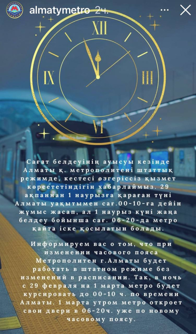 Сообщается, что в ночь с 29 февраля на 1 марта поезда будут курсировать до 00:10 по времени Алматы. 1 марта метро откроет свои двери в 06:20 уже по времени нового часового пояса.