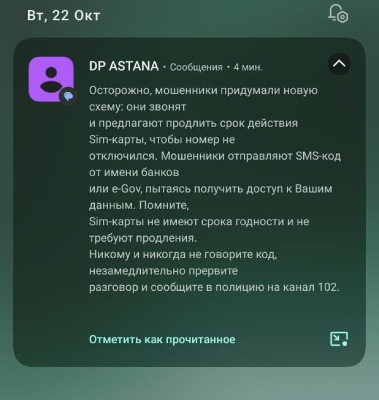 "Осторожно, мошенники придумали новую схему: они звонят и предлагают продлить срок действия сим-карты, чтобы номер не отключился. Мошенники отправляют SMS-код от имени банков или e-GOV, пытаясь получить доступ к вашим данным. Помните, сим-карты не имеют срока годности и не требуют продления. Никому и никогда не говорите код , незамедлительно прервите разговор и сообщите в полицию на канал 102", - говорится в тексте рассылки, которую направил департамент полиции Астаны.