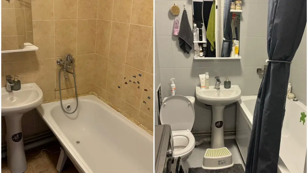 "Год назад мы делали ремонт в доме. И хоть квартира у нас маленькая, всего 40 квадратов, замена пола, выравнивание стен и их покраска обошлись очень дорого. К тому же после того, как квартира преобразилась, старая мебель в ней стала вдруг выглядеть несуразно. И было решено снова отложить ремонт последней оставшейся ванной комнаты и обновить мебель. Однако ремонт в ванной от застройщика - желтая плитка и старая ванная с ржавым пятном посередине – раздражали нас с супругом все больше и больше. Поэтому я предложила сделать максимально бюджетный ремонт", – поделилась девушка.