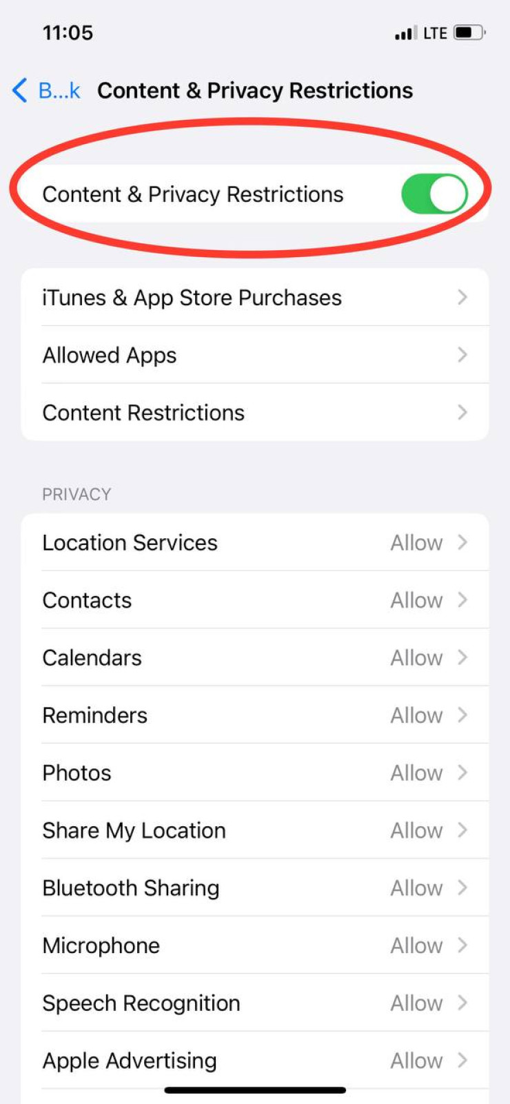 - Смахните ползунок в строке "Контент и конфиденциальность", если он не был активирован ранее;