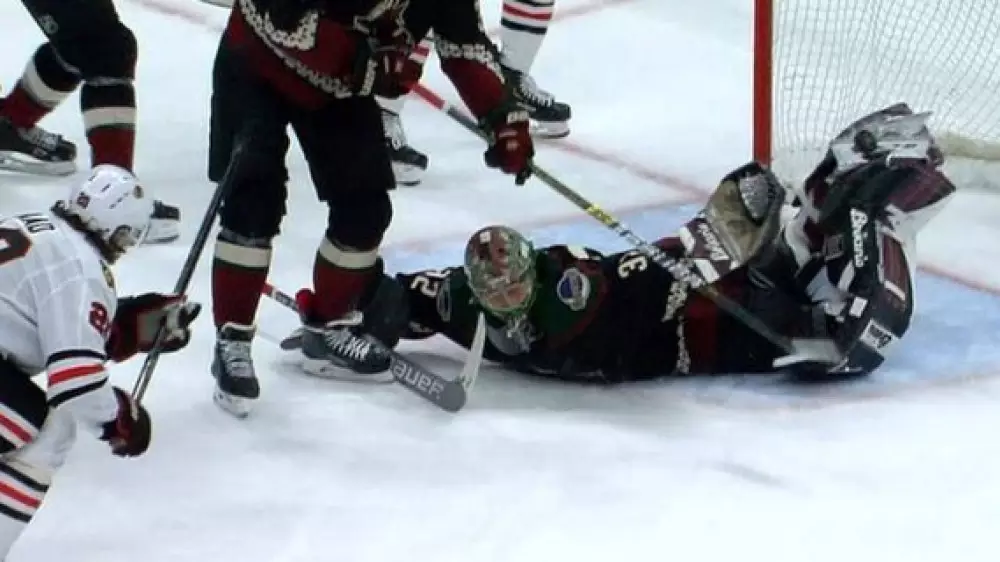 Вратарь "Аризона Койотис" Антти Раанта отразил шайбу "ударом скорпиона" во время матча регулярного чемпионата Национальной хоккейной лиги (НХЛ) против "Чикаго Блэкхоукс", передает Vesti.kz.