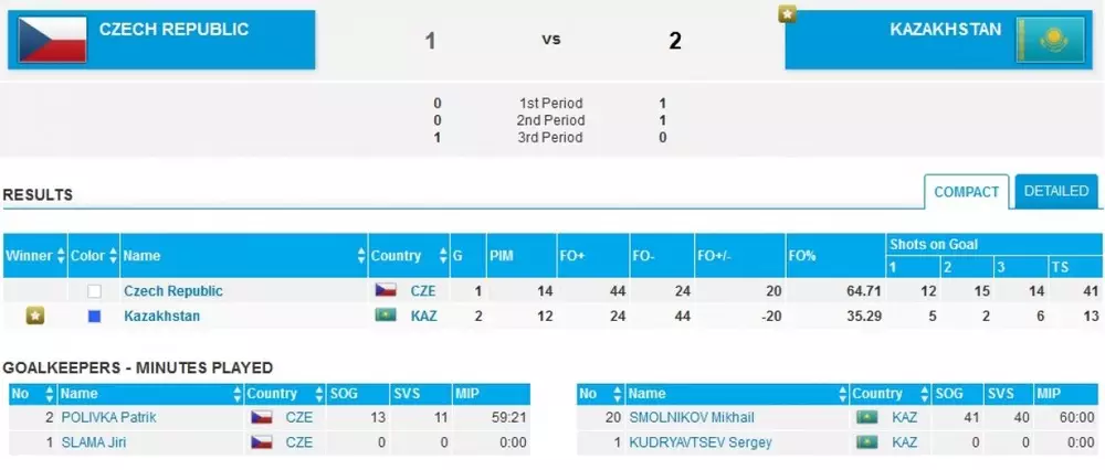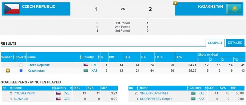 В полуфинале казахстанские хоккеисты встретились с командой Чехии. Игра завершилась со счетом 2:1. Алексей Анциферов открыл счет на 12-й минуте. Во втором периоде Павел Зятьков удвоил счет. Чехи сумели отыграть одну шайбу в третьем периоде, отличился Петр Сколоуд.