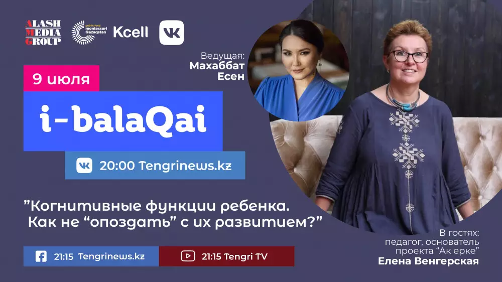 Сегодня, 9 июля, в 20.00 во "ВКонтакте" Tengrinews.kz спикер поговорит на тему "Когнитивные функции ребенка и как не "опоздать" с их развитием?".