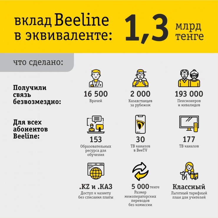 На период карантина и ЧП Beeline предоставил нетарифицируемый доступ к ресурсам Казнета с доменами .KZ и .КАЗ, а также нетарифицируемые звонки внутри сети для абонентов мобильной связи актуальной тарифной линейки. Для пользователей фиксированного Интернета доступ на казахстанские ресурсы также будет сохранен при отсутствии абонентской платы.