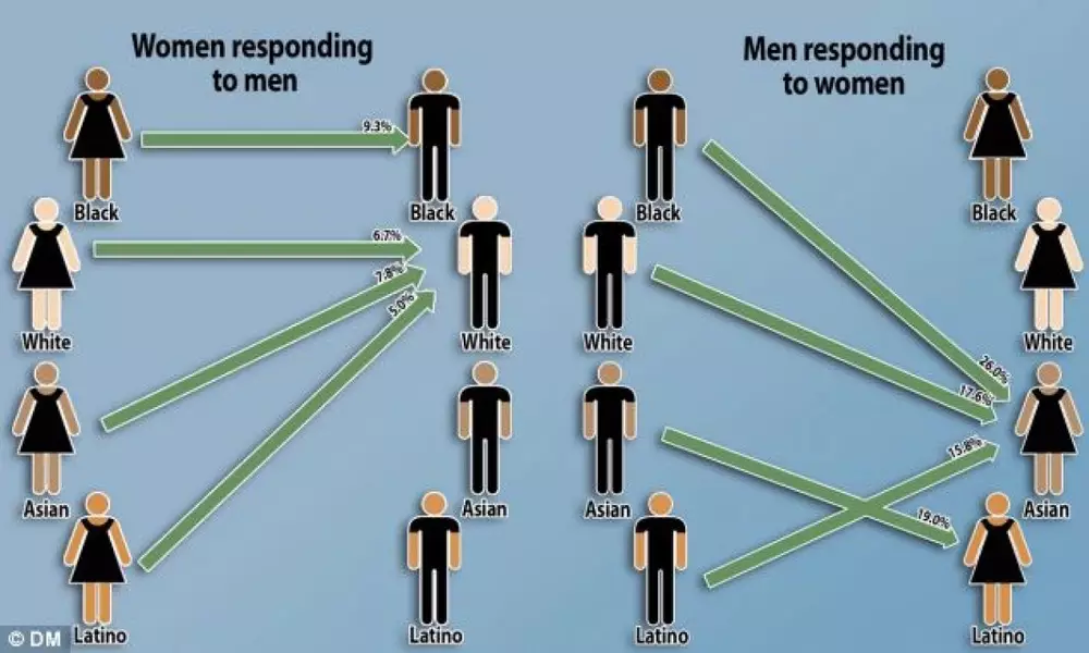 Так, белые женщины, азиатки и латиноамериканки чаще всего откликаются на предложения белых мужчин и меньше всего обращают внимание на черных. И только черные женщины выбирают представителей своей расы и меньше всего отвечают взаимностью белым мужчинам.
