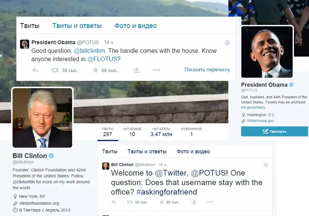 Билл Клинтон поприветствовал Барака Обаму как нового пользователя соцсети и спросил о том, останется ли аккаунт @POTUS (Президент США) в распоряжении Белого дома. Обама ответил, что вопрос Клинтона действительно хороший и пояснил, что аккаунт принадлежит хозяину Белого дома. Барак Обама также спросил, знает ли Клинтон кого-нибудь, кто заинтересован в аккаунте @FLOTUS (первая леди), который в настоящий момент ведет Мишель Обама.