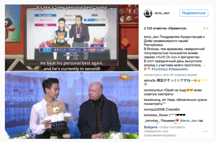 "Поздравляю казахстанцев с Днем независимости нашей Республики. В Японии, тем временем, невероятной популярностью пользуется аниме-сериал Yuri On Ice о фигуристах. В этот праздничный день выпустили эпизод с участием моего прототипа", - написал Тен в Instagram.