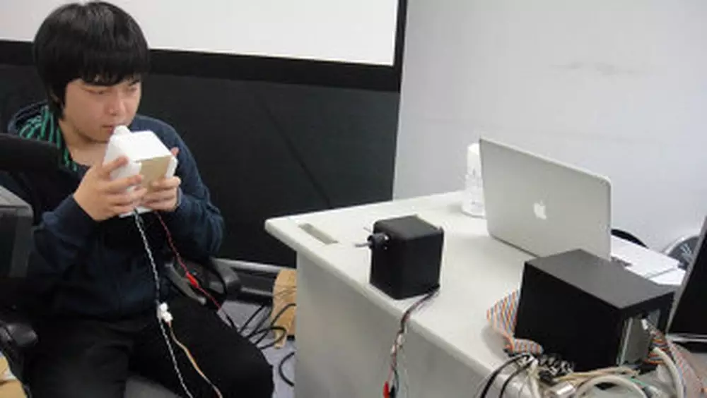 Прибор представляет собой два парных аппарата, которые подключаются к компьютеру. Два пользователя, находящиеся далеко друг от друга, помещают в рот изогнутый пластиковый наконечник и вращают языком по часовой стрелке или против нее. Их действия синхронизируются через интернет: если один из партнеров начинает вращать наконечник своего аппарата, у второго пользователя он также приходит в движение.