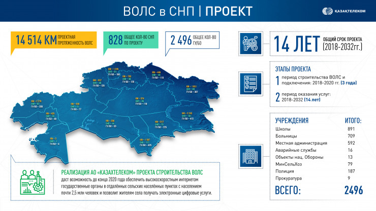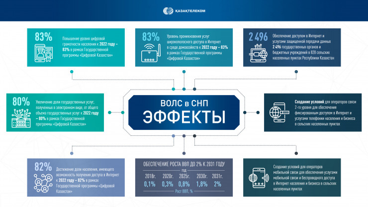 Фактически сотовые операторы уже получили возможность разворачивать сети в казахстанских деревнях. Оператором Tele2 в содружестве с "Казахтелекомом" уже осуществлен пробный проект в селе Егендибулак Карагандинской области. ВОЛС даст возможность покрыть сетью порядка 5,5 тысячи деревень из 6 тысяч сельских населенных пунктов в республике, и доступ к широкополосному интернету получит около 90 процентов населения.