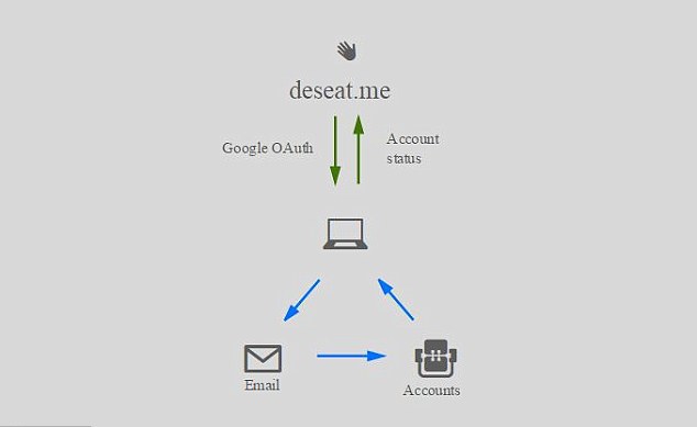 Работает это следующим образом. Вы заходите на сайт Deseat.me через свой Google-аккаунт. После этого сервис проверяет все места, где вы регистрировались при помощи почты Gmail. В результате перед вами появится список учетных записей, которые можно отправить в небытие одним нажатием мышки.