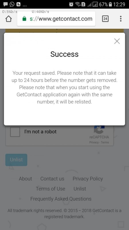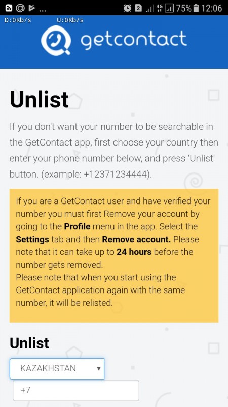 - зайти на сайт getcontact.com, найти раздел Unlist. Там необходимо ввести свой номер телефона. Вам придет SMS с кодом, который надо вбить на сайте, затем начнется процесс удаления, который может занять до 24 часов.