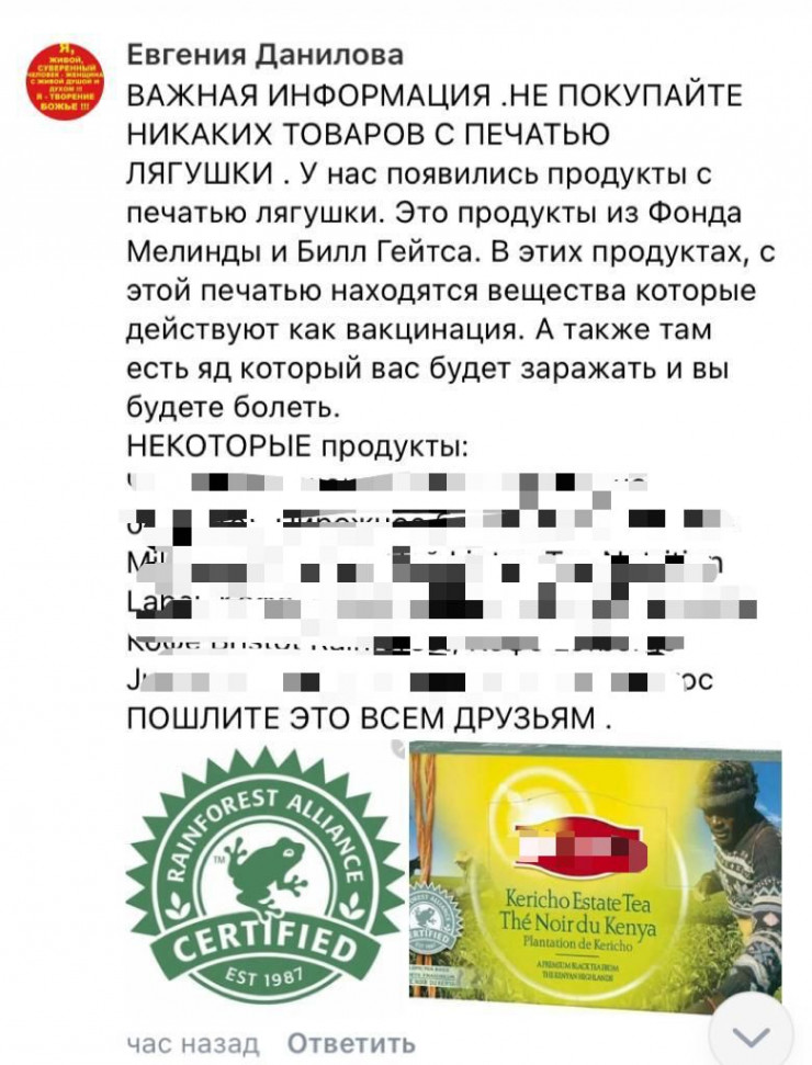 В своем сообщении женщина заявила, что в продуктах с "печатью лягушки" содержится яд и действует он как вакцинация.