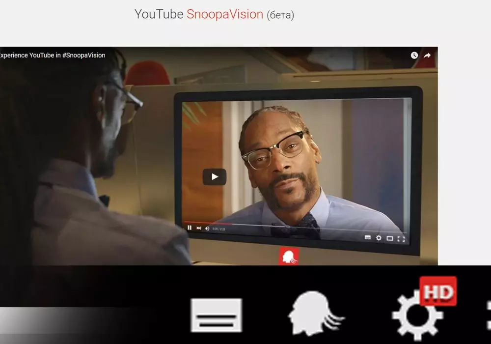 Для запуска инновационной функции, при просмотре любого ролика, необходимо нажать на специальную кнопку, изображенную в виде головы рэпера, которая находится в нижнем правом углу видеоплеера. По задумке, нажав на нее, пользователь попадает в кинотеатр, где Snoop Dogg просматривает именно этот клип и комментирует его. При этом, пользователь может вращать камеру в любом направлении.