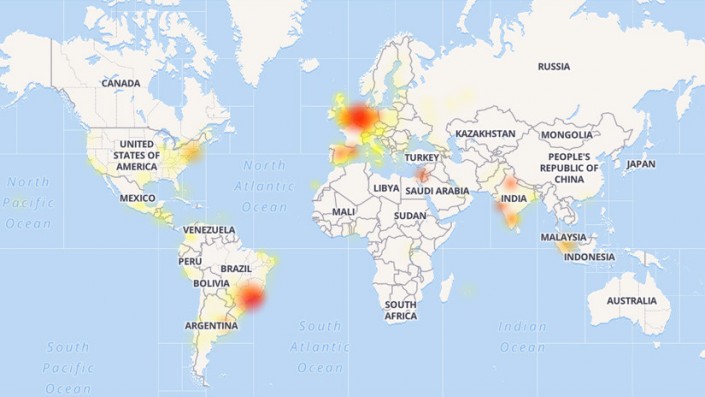 Регионы мира, где пользователи больше всего пожаловались на сбой в работе WhatsApp. © downdetector.com