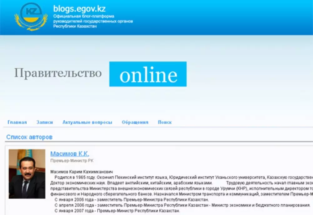 Блог главы правительства РК Карима Масимова оказался самым посещаемым среди официальных блогов казахстанских министров. Об этом свидетельствуют результаты социологического опроса, проведенного Институтом политических решений (ИПР).