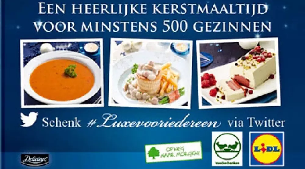 10 декабря компания заявила, что подарит пользователям Twitter по пять рождественских обедов из четырех блюд - томатного супа, курицы с жареной картошкой, пирога и конфет. Для этого надо было опубликовать твит с хештегом #luxevooriedereen. Изначально Lidl рассчитывали, что подарят около тысячи обедов стоимостью 4 евро каждый.