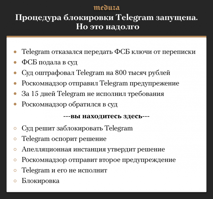 Между тем, как отмечает Meduza, сколько времени займет вся процедура блокировки - неизвестно. Но это не быстрый процесс.