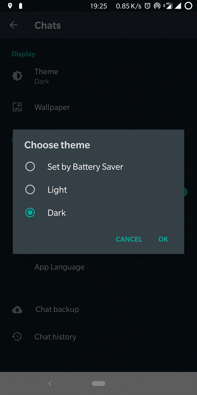 На выбор предлагаются три темы - светлая, темная и вариант под названием Set by Battery Saver. Последний вариант позволяет WhatsApp автоматически переключаться между светлой и темной темами.