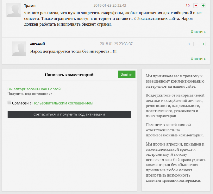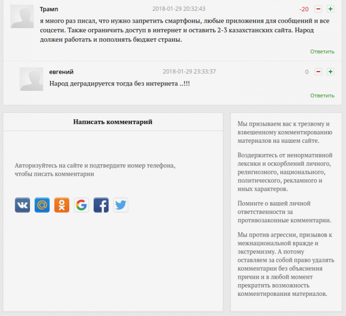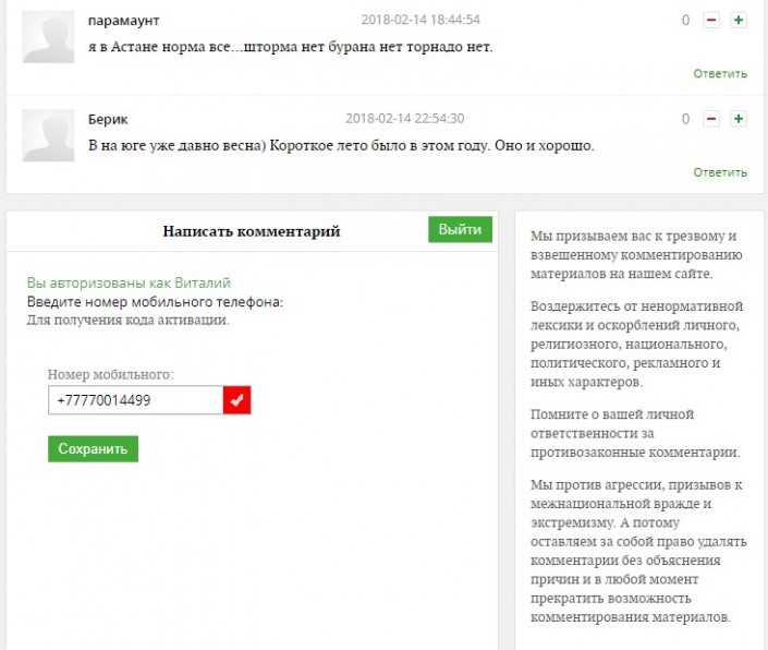 В настоящий момент размещение комментариев на нашем сайте под своим именем или псевдонимом (вымышленным именем) возможно только после регистрации по номеру мобильного телефона. Регистрация является бесплатной и доступна для абонентов казахстанских сотовых операторов.