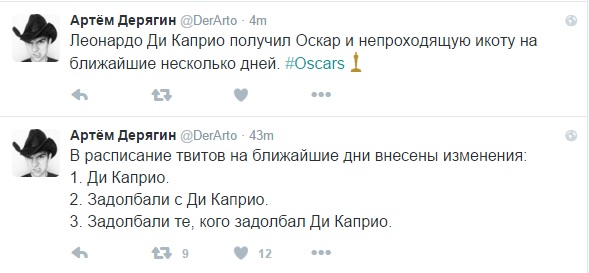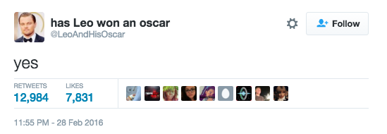 Также появился специальный аккаунт под названием "Выиграл ли "Оскар" Лео". Последняя запись, собравшая большое количество лайков и ретвитов, состоит из одного слова - "Да".