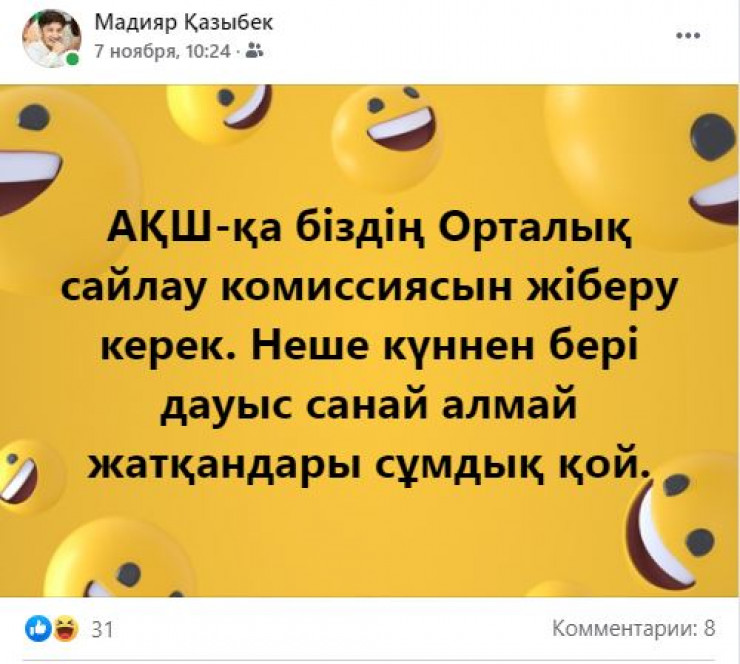 АҚШ-тың сайлау жүйесі қазақстандықтарды ғана таңғалдырмаған сияқты. "Америкалықтар сайлауда кім жеңгенін болжап жатыр. Қалған елдер америкалық сайлау жүйесінің жұмысын түсінбей әлек", - деп әзілдейді желі қолданушыларының бірі.