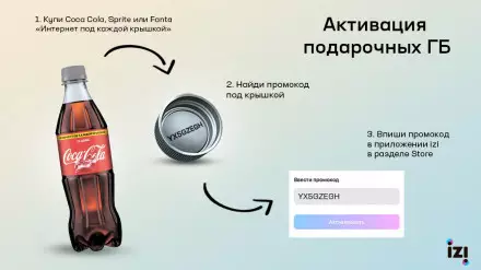Бесплатный интернет ждет вас под каждой крышкой бутылок Coca-Cola, Coca-Cola без сахара, Fanta и Sprite объемом 0,5 литра, где вы найдете подарочные промокоды. Узнать бутылку, которая принесет вам бонусные ГБ от izi, можно по серебристой крышке. Открыв ее, вы можете выиграть от 1 до 10 ГБ трафика, активировать которые нужно в приложении izi.