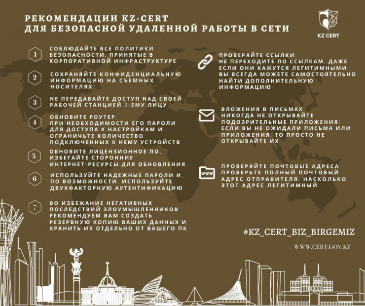 Эксперты KZ-CERT разработали памятку с рекомендациями, как обеспечить непрерывный рабочий процесс и защитить себя от действий злоумышленников, передает  Tengrinews.kz.