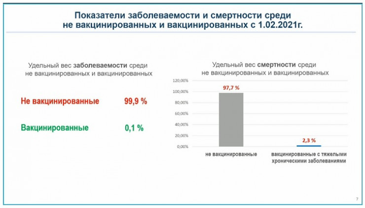 По словам главы Минздрава, удельный вес летальности от COVID-19 среди непривитых составил 97,7 процента, тогда как на вакцинированных приходится 2,3 процента. При этом, как отметил Цой, вакцинированные имели тяжелые хронические заболевания.