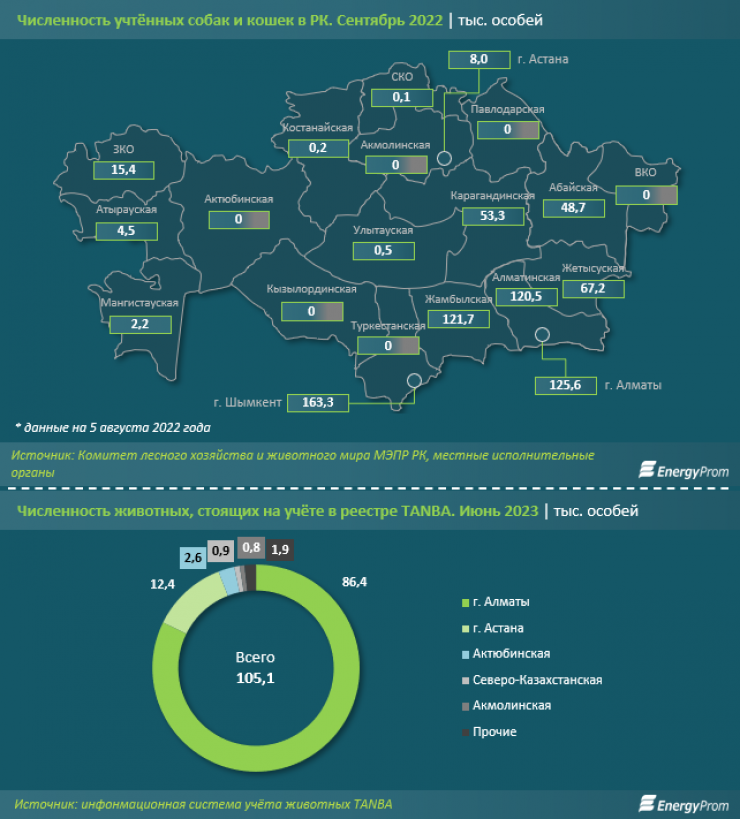Судя по актуальной информации из национального реестра зарегистрированных животных в системе TANBA, работа со стороны местных исполнительных органов этих регионов все же началась. По данным на 27 июня, в базу данных TANBA внесена информация о чипировании 105,1 тысячи животных. Из них 2,6 тысячи поставлено на учет в Актюбинской области, 492 — в Восточно-Казахстанской, 57 — в Павлодарской. Большинство в реестре — питомцы алматинцев: ветклиники южной столицы внесли данные о 86,4 тысячи животных.