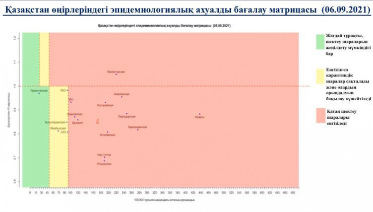 По данным комиссии, матрица оценки эпидемиологической ситуации в регионах Казахстана на 6 сентября выглядит следующим образом: