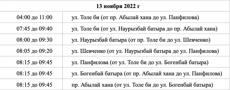 Движение по улице Толе би от улицы Наурызбай батыра до проспекта Абылай хана будет перекрыто с 07:45 до 09:40.