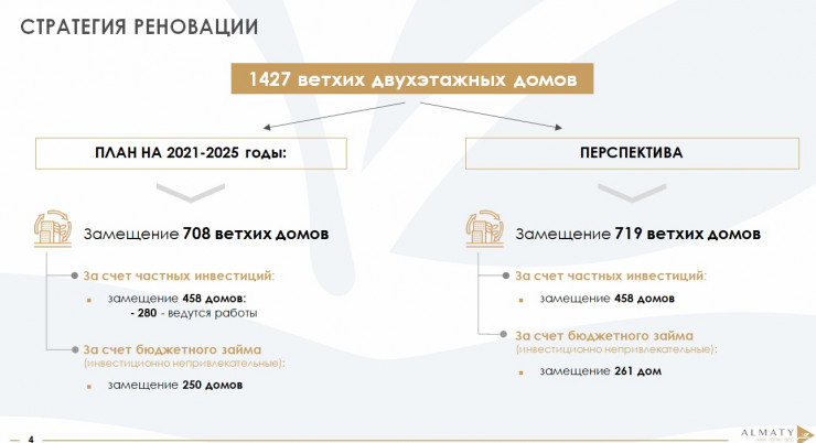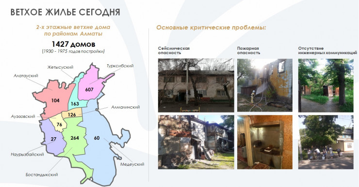 "В Алматы достаточно высокая концентрация ветхого жилья. Мы выбрали самые критичные точки. Это 1427 домов, которые построены в период с 1930-х по 1975 годы. Работы разбили на два этапа: то, что реалистично сделать в ближайшие годы, и то, что можно сделать в перспективе. На сегодня реалистично замещение 708 ветхих домов. За счет частных инвестиций - 458 домов, по 280 из них ведутся работы. А также за счет бюджетного займа - 250 домов. В настоящее время ни одного тенге не выделено по данной программе. Мы находимся на этапе планов и процесса проработки с министерством", - пояснил Аскар Билисбеков.