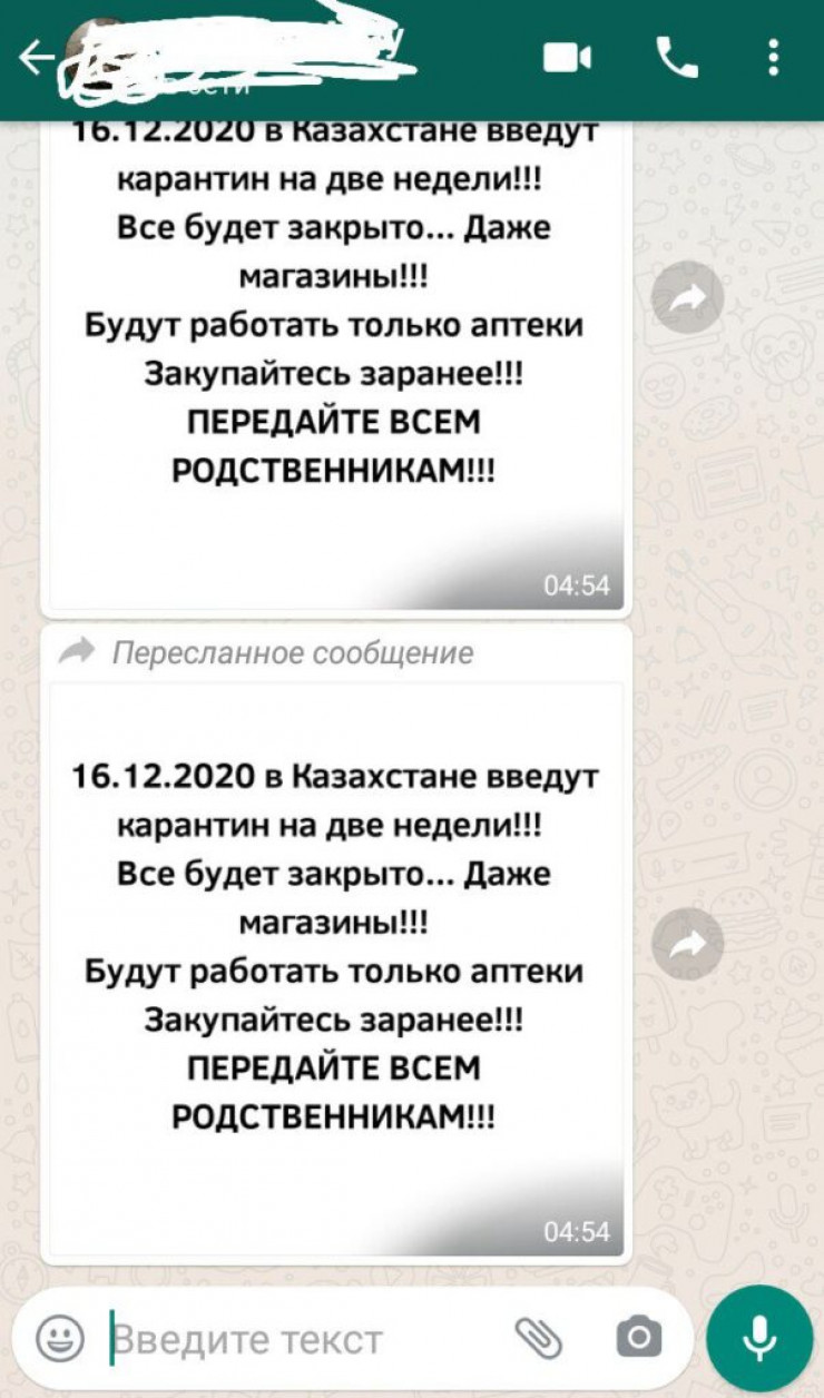 "16.12.2020 күні Қазақстанда екі апталық карантин енгізіледі. Бәрі жабылады, тіпті, дүкендер де. Тек дәріханалар жұмыс істейді. Алдын ала бәрін сатып алыңдар. Туыстарыңа айтыңдар", - делінген хабарламада.