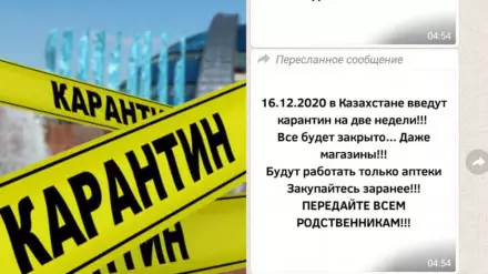 "16.12.2020 күні Қазақстанда екі апталық карантин енгізіледі. Бәрі жабылады, тіпті, дүкендер де. Тек дәріханалар жұмыс істейді. Алдын ала бәрін сатып алыңдар. Туыстарыңа айтыңдар", - делінген хабарламада.