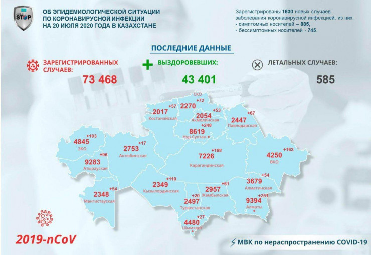 Общее число заразившихся в Казахстане выросло до 73 468 случаев, из них: