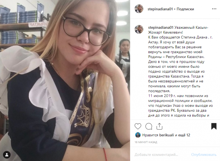 18-летняя Диана Степина из Актау поблагодарила Президента Касым-Жомарта Токаева за возвращенное ей гражданство Казахстана. Своей историей она поделилась в Instagram, передает корреспондент Tengrinews.kz.