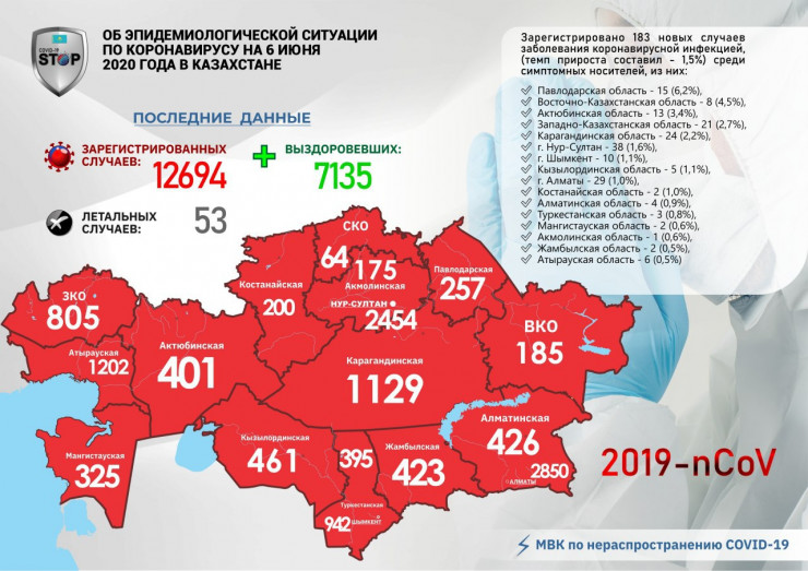 В Казахстане за прошедшие сутки (6 июня) выявлено 183 заболевших коронавирусной инфекцией, сообщает Tengrinews.kz.