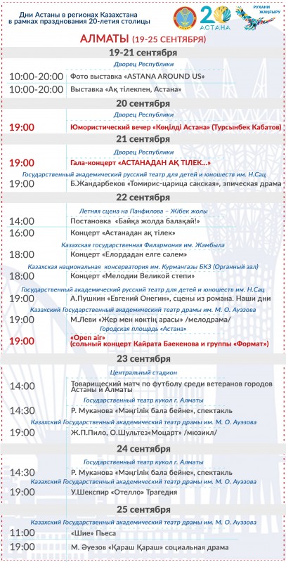 В Алматы в честь 20-летия Астаны пройдут гала-концерт, Open-air, вечер сатиры Турсынбека Кабатова, театральные постановки, концерты столичной филармонии, фотовыставки и футбольный матч. Об этом сообщили в управлении культуры и спорта Астаны, передает Tengrinews.kz.