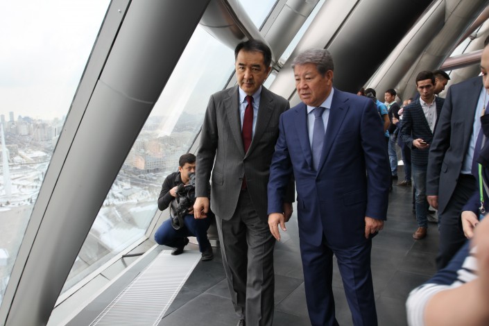 К прибытию премьер-министра сфера была заполнена посетителями. Сагинтаев и председатель правления нацкомпании "Астана ЭСКПО-2017" Ахметжан Есимов вместе с другими посетителями поднялись на восьмой этаж и уже оттуда начали свой осмотр.