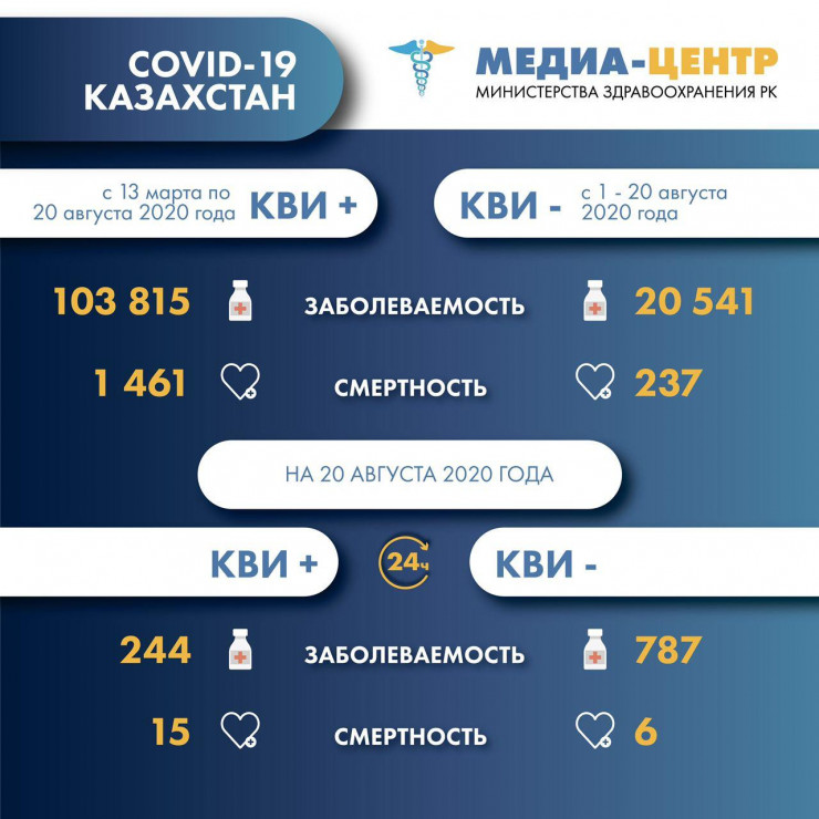 Ранее сообщалось о 244 новых случаях COVID-19, выявленных в Казахстане. Общее число заболевших коронавирусом выросло в стране до 103 815. Выздоровели 86 450 пациентов.