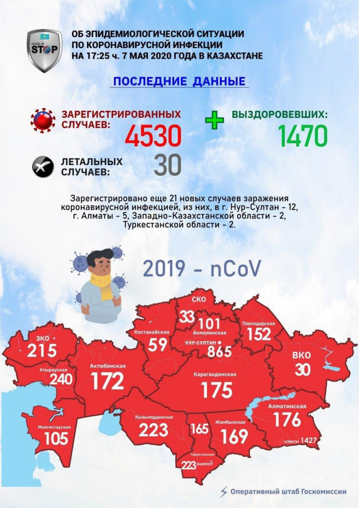 По состоянию на 17.25 часов 7 мая в Казахстане зарегистрирован еще 21 новый случай заражения коронавирусной инфекцией. Из них в Нур-Султане - 12, в Алматы - 5, в Западно-Казахстанской области - 2, в Туркестанской области - 2.